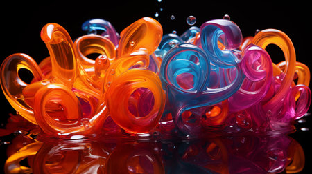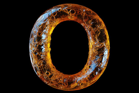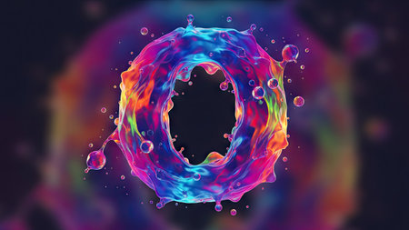 3d illustration of colorful liquid letter O with splash and drops on black background