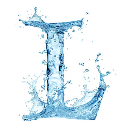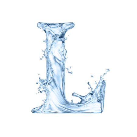 Texture of water and splashes on white background. The symbolic letter L for the original alphabet. L Print Template. Latin letter L of water splashes. Water splashes. Concept of Fluid Typography.