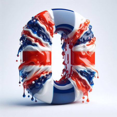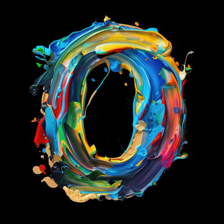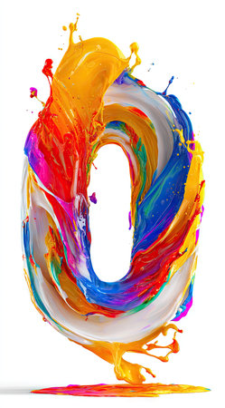 An artistic representation features the number zero formed by vibrant, swirling paint. Multiple colors blend and splash, creating dynamic forms. The bright design is set against a clean white backdrop. Suitable for various creative projects and design applications that require visual impact.