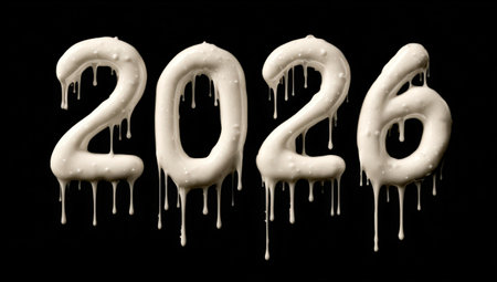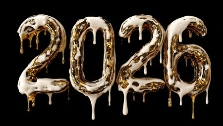 The year 2026 is artistically depicted in dripping white, symbolizing the New Year. This creative representation conveys festive cheer during the Christmas holiday, highlighting jo