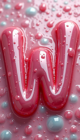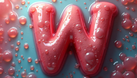 A striking close-up of a glossy pink letter W is beautifully embellished with vibrant droplets of varying sizes. The playful arrangement of water droplets adds a refreshing touch, creating a visually captivating scene that evokes a sense of fun and creativity.
