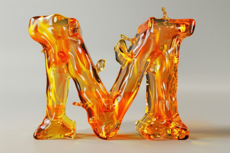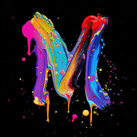 Colorful letter M with drops and splashes on black background.