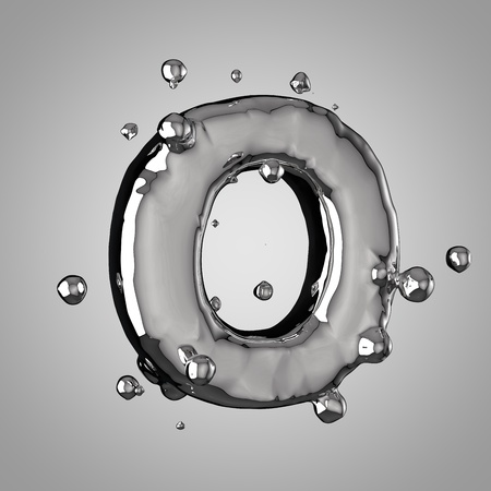 3D mercury letter O uppercase. 3D rendering liquid metal font with drops isolated on light background.