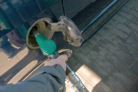 A man's hand holds a green refueling gun. Filling gun inserted into the hole of a empty gasoline tank of a car on a diesel fueling