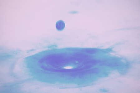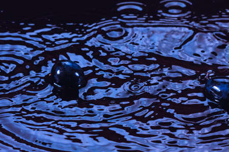 Blue and purple water drops suspended in the air and forming waves on the liquid surface, representing tranquility or serenity
