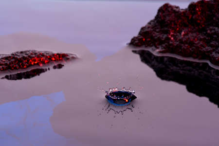 Panoramic view of a flying drop of water macro with rippling water surface in neon blue-pink colors