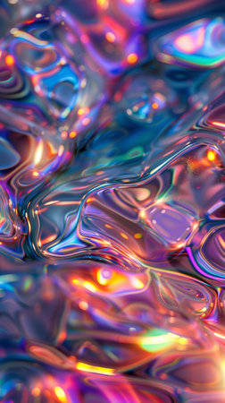 Abstract showing close-up of iridescent liquid surface with swirling rainbow colors and undulating wave-like...