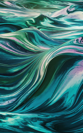 An abstract artwork showcasing fluid art with swirling waves of teal, green, and purple hues, creating a mesmerizing visual texture.