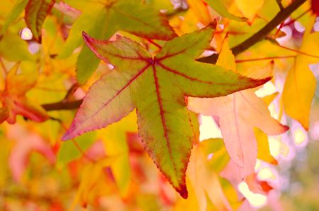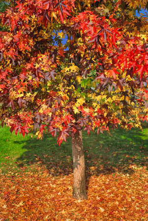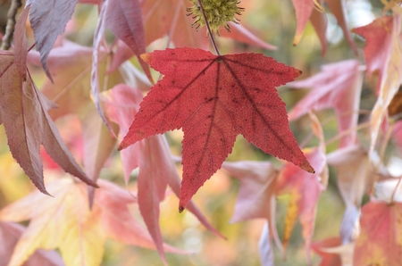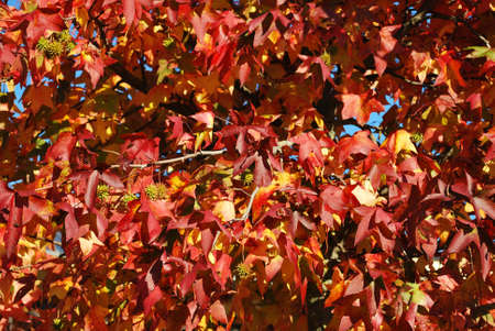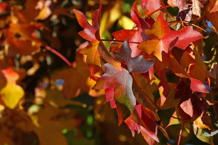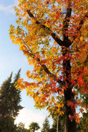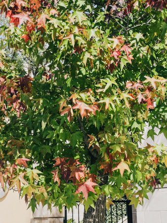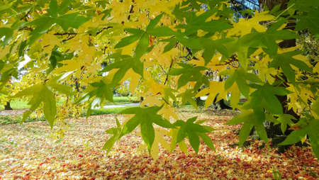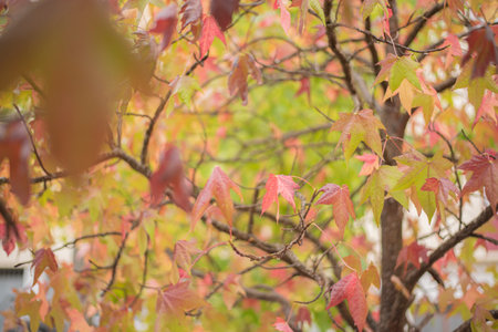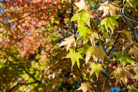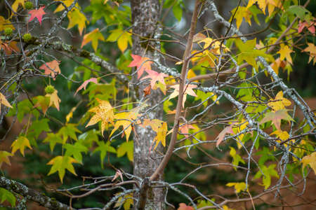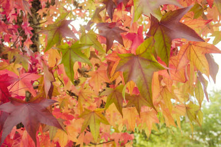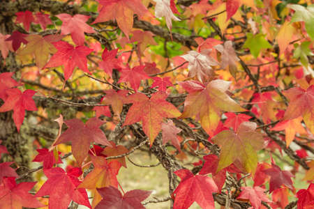 Colorful autumn foliage of the liquidambar tree with red, yellow and green leaves