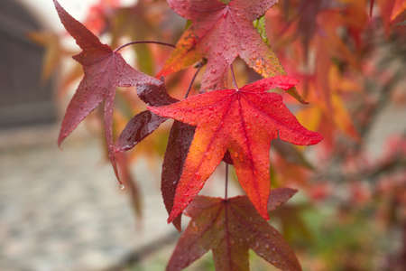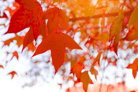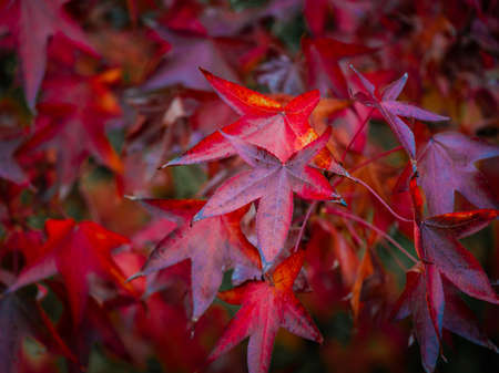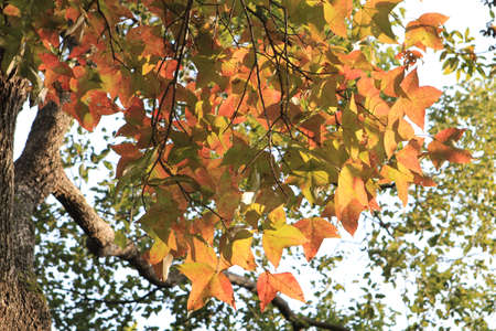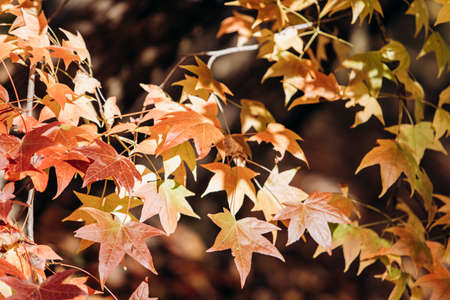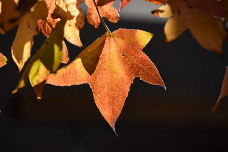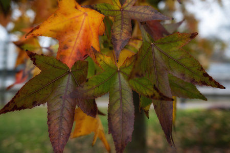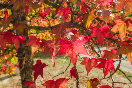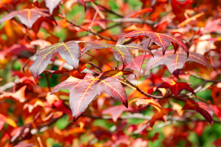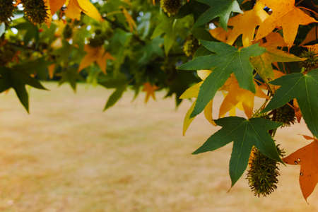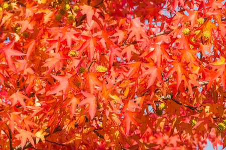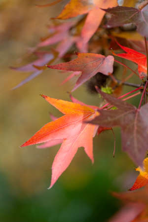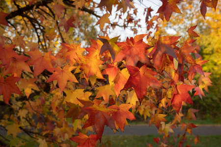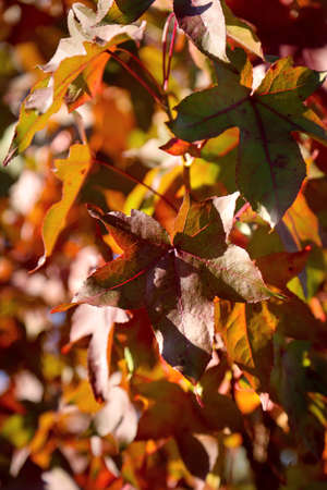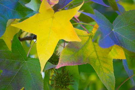 Autumn leaves of American sweetgum. Altingiaceae deciduous tree.