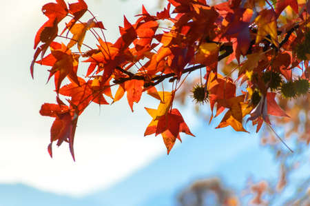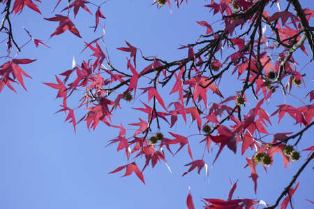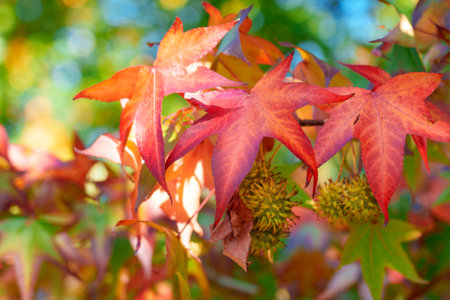 Red pointed leaves and green prickly fruits of the sweetgum tree in autumn day