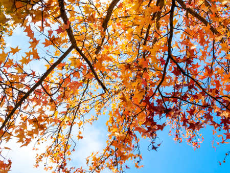 Colorful leaves on tree with cloudy blue sky in background, autumn season background texture
