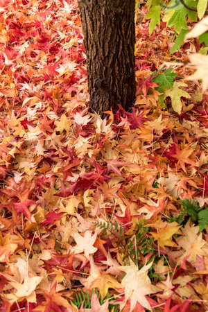 carpet of dry autumn leaves yellow and red and green at the foot of a maple