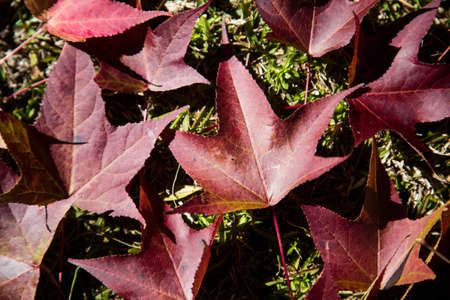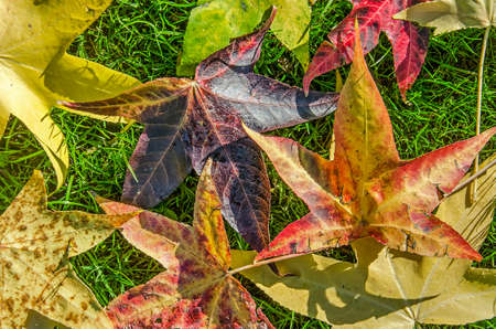 Close-up of several leaves of a sweet gum tree (liquidambar styracuflua) on a lawn in a garden in autumn