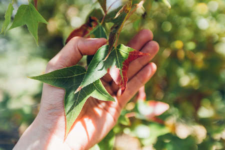 Closeup of the summer green maple-like leaves of the garden tree liquidambar styraciflua worplesdon.