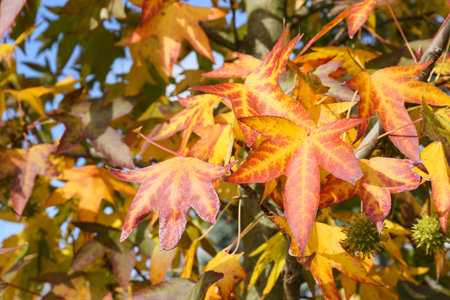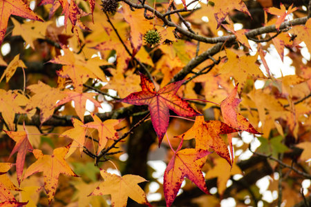 Sweetgum, sweetgum tree or copalm balsam with fall foliage and seeds, altingiaceae
