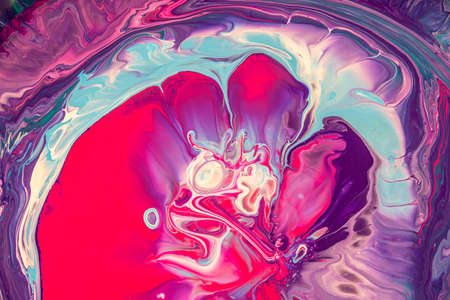 Fluid art texture. Backdrop with abstract iridescent paint effect. Liquid acrylic artwork with flowing bubbles. Mixed paints for interior poster. Turquoise, purple, pink and white overflowing colors