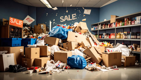 The interior of a chaotic shop is overwhelmed with trash and discarded goods, showing neglect and disarray.