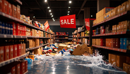 Flooded department store with products spilling from shelves in chaotic wave, SALE signs hanging crookedly, overconsumption metaphor.