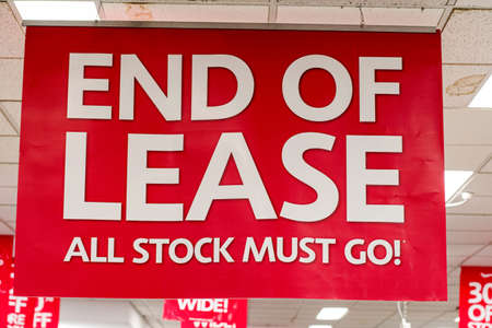 Sydney, Australia 2020-02-22 End of lease All stock must go sign hanging from the ceiling at closing down Lincraft Miranda store