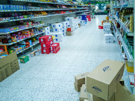 TALLINN, ESTONIA – MARCH 15 2020: View on empty shelves and boxes in supermarket after panic buying in corona crisis. People are hoarding food to prepare for the worst in Coronavirus scare.