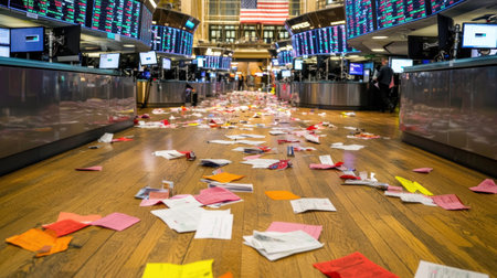 Scattered papers on trading floor create chaotic atmosphere in dim light.