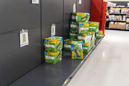 21 March 2020 - Calgary, Alberta Canada - Empty tissue and toilet paper shelves in supermarket . Panic.Buying