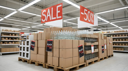 Supermarket aisle with pallets of cardboard boxes and glass bottles under big SALE and -50 signs, Black Friday promotion display, retail discount event in bright fluorescent lighting.