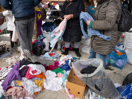 Barcelona (Catalonia, Spain) - January 8, 2022: Unidentified people choose a product among the stalls of Barcelona's most famous flea market, located in the Glories district.