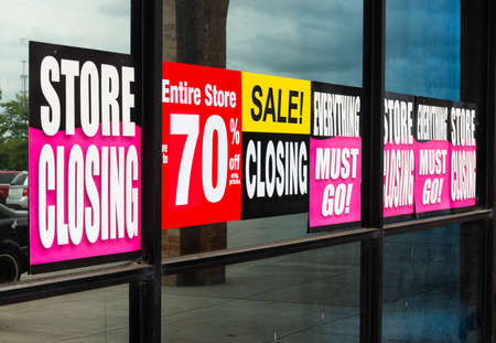 Horizontal shot of Going Out of Business signs in a retail store’s windows.