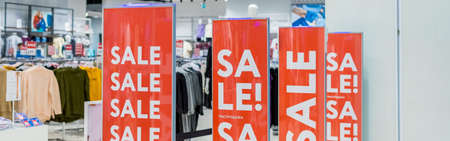 Sale sign at the entrance to clothing store,large red panels with white words. Seasonal discount offer in store. Discounts and black friday concept.Fashion concept,offline shopping, holiday sales.