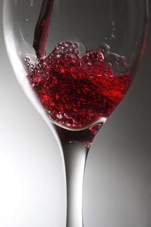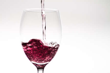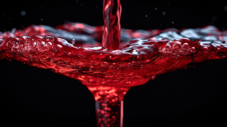 Red liquid splashes dramatically as it is poured into a glass showing movement and energy.