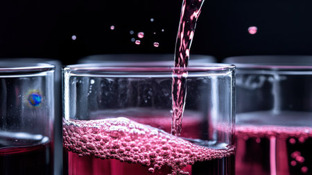 A dynamic shot of vibrant pink liquid being poured into clear glasses, showcasing bubbles and reflections, perfect for beverage, refreshment, and celebration themes.