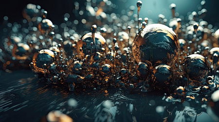this stunning hd wallpaper features water droplets in black and gold, with a unique distorted figurative form. the luminous 3d objects in white and silver add to the tactile landscape, while the mechanized abstraction and silver tones create a truly mesmerizing effect. created by renowned artist mike campau, this wallpaper is a true work of art. ai generated