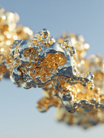 Golden and silver textures blend together in an abstract formation, illuminated against a light blue background, creating a surreal fluid effect.