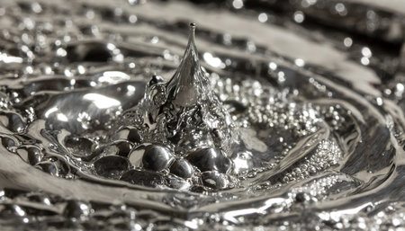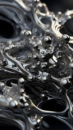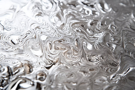 An intricately close-up view of liquid shiny metal featuring silver-gray tones, radiant highlights, and delicate shimmers, perfect for artistic projects or futuristic and luxurious design concepts.