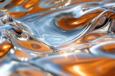 A striking background featuring the fluid texture of liquid metal in contrasting orange and blue hues. This dynamic and reflective surface creates a bold visual effect, perfect for enhancing digital artwork, presentations, or any creative project that requires a modern and eye-catching design element.