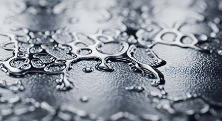 Swirling patterns of clear liquid create a mesmerizing effect in an abstract design. The smooth, reflective surface highlights intricate details, enhancing the visual appeal.