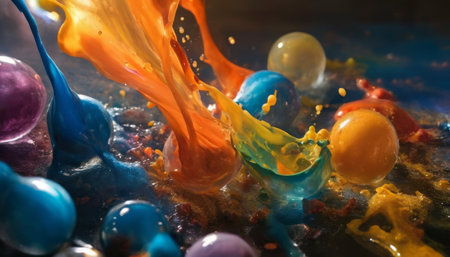 Stunning abstract image showcasing colorful liquid splashes and droplets with dynamic swirls, perfect for artistic projects and creative designs.