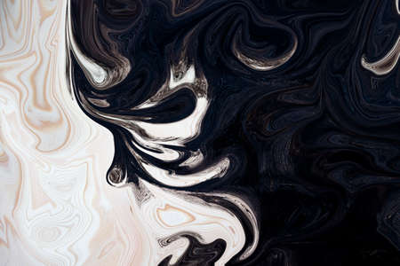 Fluid art texture. Background with abstract swirling paint effect. Liquid acrylic artwork with chaotic mixed paints. Can be used for posters or wallpapers. Orange, black and blue overflowing colors