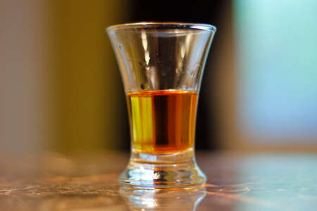 Liquor or alcohol drink in transparent mug with reflection.