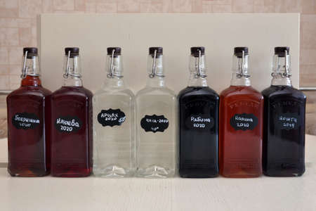 MOSCOW, RUSSIA - JANUARY 17, 2021: homemade moonshine with different flavors. Handwritten lettering in Russian