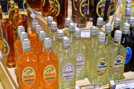 Ufa, Russia, 1 January, 2020: Several types of bottled alcohol are displayed on some shelves in a pub.