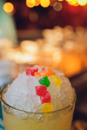Sweet Famous white with caramels decoration slice Author inspired Cocktail Drink - on bar counter . Close-up Top view . Copy paste space for design people and luxury service barman in nightclub
