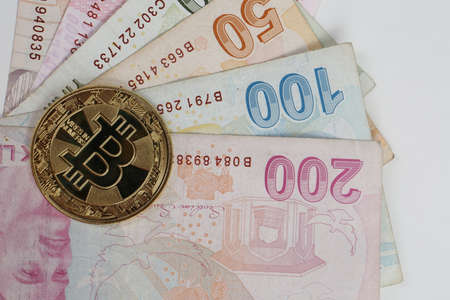 close up bitcoin coin and magnifying glass with turkish lira banknotes on background