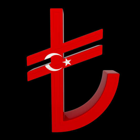 Currency symbol with national flag. Turkish lira. 3d render isolated on black. Front view.