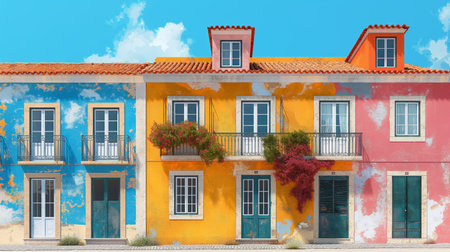 Line up of multi colored tiled facade buildings in Alfama district of Lisbon Portugal