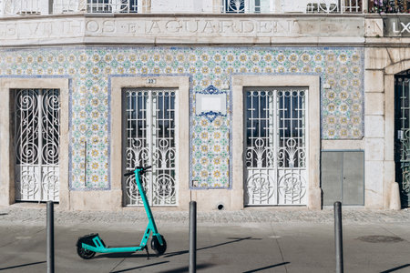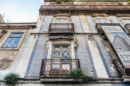 Lisbon, Portugal - December 28, 2024: A historic facade in downtown Lisbon covered with iconic azulejo tiles