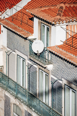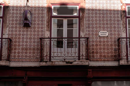 typical historic vintage house facade with windows and balcony in an old tile facade with geometric pattern, picturesque architecture at Lisbon, Portugal