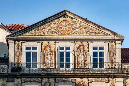 Lisbon, Portugal - January 2, 2025: A detailed view of a historic building facade adorned with traditional Portuguese azulejos, featuring painted figures and a prominent eye and star motif, set agains